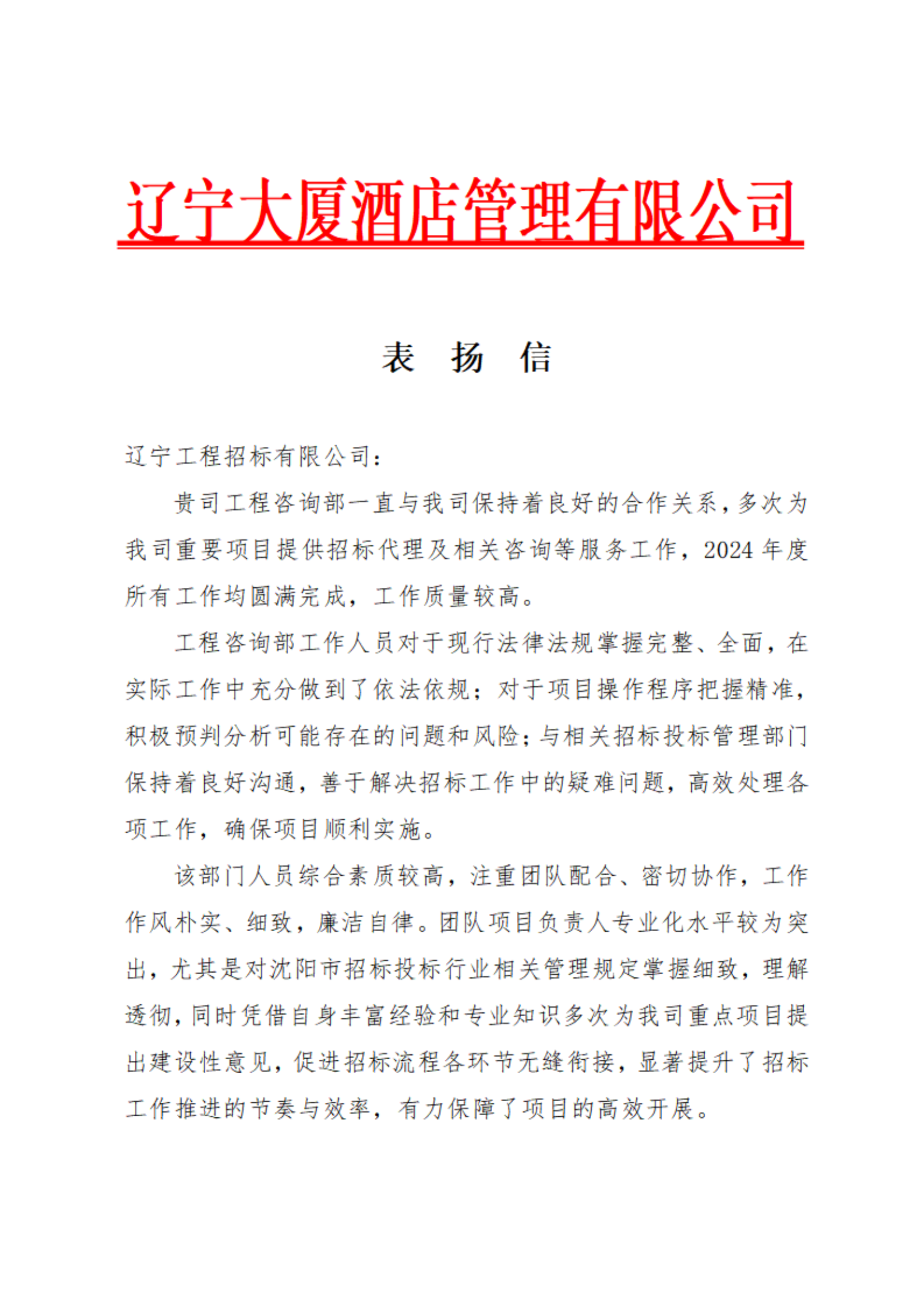 近日,球速体育收到辽宁大厦发来的表扬信,对球速体育业务团队在招标代理及相关咨询服务等工作中表现出的丰富经验和专业水平表示认可。